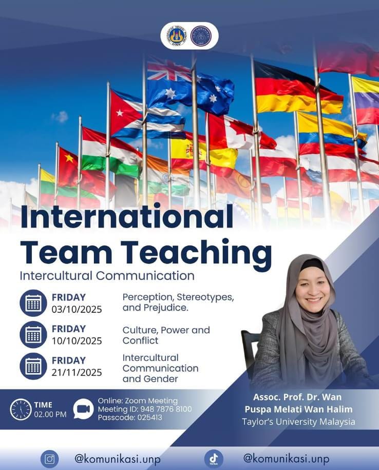 Padang, 3 Oktober 2025 – Program Studi Ilmu Komunikasi Universitas Negeri Padang (UNP) kembali menggelar kegiatan International Team Teaching bertema “Intercultural Communication: Perception, Stereoty...