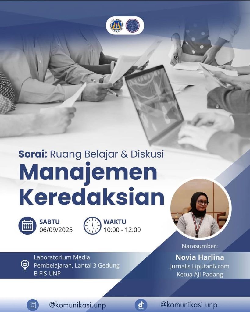Padang, 6 September 2025 – Sabtu (6/9) Program Studi Ilmu Komunikasi Universitas Negeri Padang (UNP) mengadakan acara pelatihan bertema “Manajemen Keredaksian” di Laboratorium Media Pembelajaran, Gedung B Fakultas Ilmu Sosial UNP.