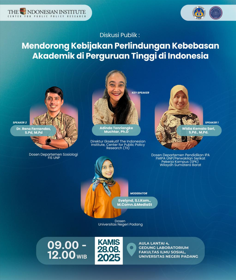 Padang, 28 Agustus 2025 – Program Studi Ilmu Komunikasi Universitas Negeri Padang (UNP) bekerja sama dengan The Indonesian Institute, Center for Public Policy Research (TII) menggelar diskusi publik bertajuk “Mendorong Kebijakan Perlindungan Kebebasan Akademik di Perguruan Tinggi di Indonesia” di Aula Gedung Laboratorium Fakultas Ilmu Sosial UNP.