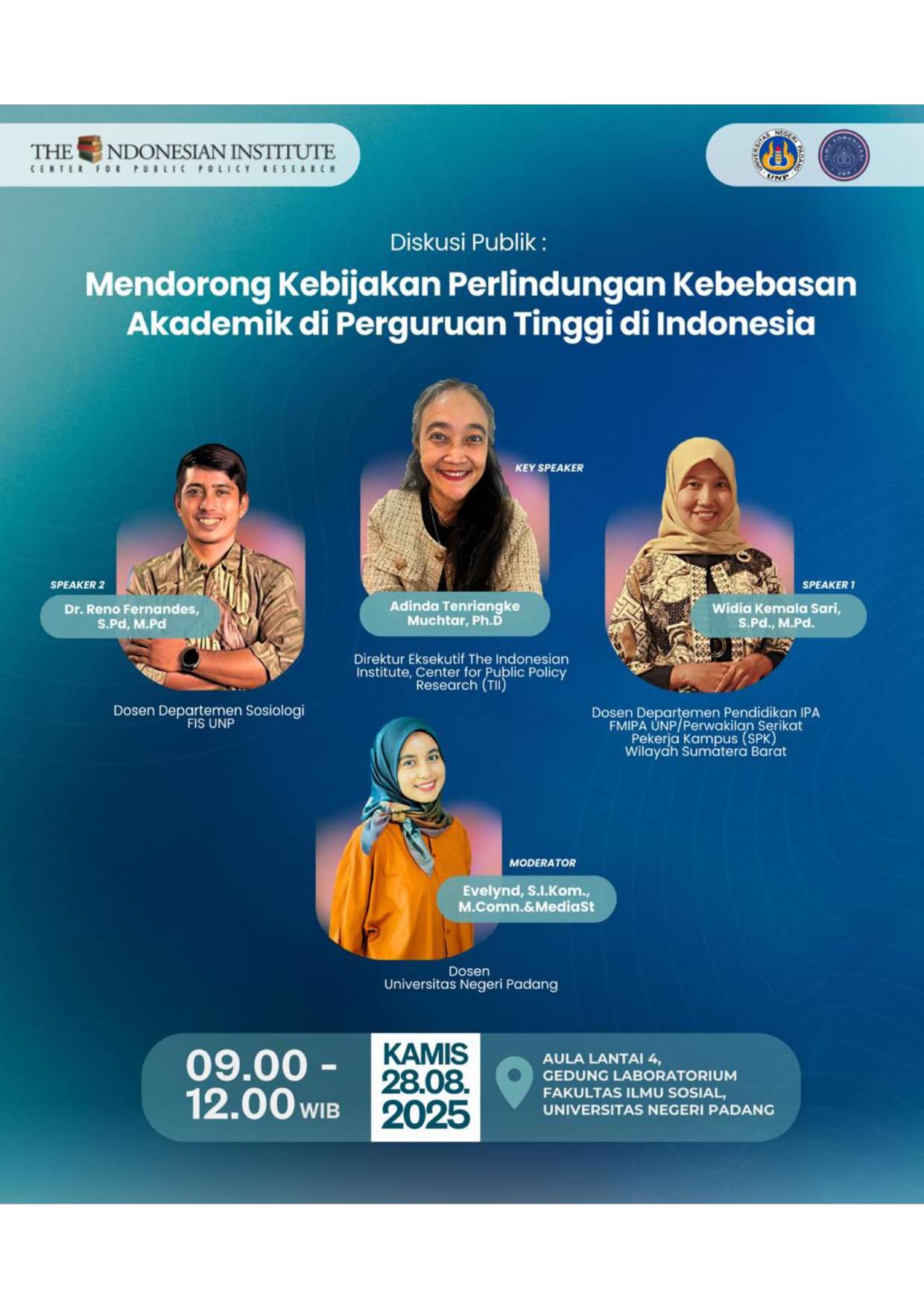 Diskusi ini menghadirkan tiga narasumber, yaitu Adinda Tenriangke Muchtar, Ph.D (Direktur Eksekutif The Indonesian Institute), Widia Kemala Sari, S.Pd., M.Pd (Dosen Departemen Pendidikan IPA FMIPA UNP/Perwakilan Serikat Pekerja Kampus Wilayah Sumatera Barat), dan Dr. Reno Fernandes, S.Pd., M.Pd (Dosen Departemen Sosiologi FIS UNP). Moderator dalam kegiatan ini adalah Evelynd, S.I.Kom., M.Comn&MediaSt, dosen Prodi Ilmu Komunikasi UNP.